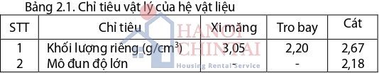 Hệ nguyên vật liệu được sử dụng tro nghiên cứu này bao gồm: xi măng portland hỗn hợp Hà Tiên PCB40, cát tự nhiên và tro bay. Tro bay được chế tạo thành cốt liệu nhân tạo và dùng để thay thế một phần cát trong vữa xi măng. Khối lượng riêng của xi măng, tro bay, và cát lần lượt là 3,05g/cm³, 2,20g/cm³ và 2,67g/cm³. Giá trị module độ lớn của cát là 2,18. Tất cả những giá trị này được thể hiện ở Bảng 2.1.