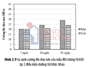 - Khi so sánh 2 điều kiện dưỡng hộ khác nhau, nhóm mẫu vữa sử dụng cốt liệu tro bay khi được dưỡng hộ 7 ngày trong nước sau đó trong không khí lại cải thiện được cường độ khi so sánh với mẫu vữa dưỡng hộ hoàn toàn trong nước. Ngược lại, cường độ chịu nén của mẫu đối chứng được dưỡng hộ hoàn toàn trong nước cao hơn so với mẫu dưỡng hộ trong nước 7 ngày rồi giữ trong khi khí.