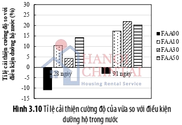 Giả thiết dùng để lý giải cho kết quả này được trình bày như sau. Quá trình phát triển cường độ của vữa xi măng cần được diễn ra trong điều kiện dưỡng hộ phù hợp (cung cấp đủ độ ẩm). Tuy nhiên, đối với mẫu đối chứng FAA00 sử dụng 100% cát, sau 7 ngày dưỡng hộ trong nước, mẫu được đem ra dưỡng hộ không khí, lúc này điều kiện dưỡng hộ bên ngoài không đủ độ ẩm. Quá trình thủy hóa chỉ được tiếp tục diễn ra nhờ lượng nước ít ỏi còn lại bên trong mẫu. Do đó, cường độ chịu nén của vữa tại 28 và 91 ngày trong điều kiện không khí nhỏ hơn cường độ của vữa trong nước. Đối với trường hợp nhóm mẫu vữa sử dụng cốt liệu tro bay, cường độ chịu nén tại 28 và 91 ngày trong không khí được cải thiện so với cường độ của vữa trong nước được đưa ra bởi hai nguyên nhân sau. Thứ nhất là ảnh hưởng của “dưỡng hộ bên trong (internal curing) từ hạt cốt liệu tro bay”. Do cốt liệu tro bay có độ hút nước bão hòa rất lớn lên tới 23,27% nên chúng có thể cung cấp thêm một lượng nước cho quá trình thủy hóa của xi măng khi mẫu vữa dưỡng hộ trong không khí. Kết quả là cường độ chịu nén được cải thiện. Thứ hai là cường độ của cốt liệu tro bay không cao. Do phương pháp chế tạo mà nhóm nghiên cứu áp dụng chỉ là sấy ở 100°C trong vòng 24 giờ đồng hồ thì chưa thể tạo ra cốt liệu có cường độ cao. Mặt khác, cốt liệu tro bay lại có độ rỗng lớn. Nên khi mẫu bị ngâm trong nước thời gian dài thì cường độ của cốt liệu tro bay sẽ giảm đi dẫn tới cường độ chịu nén của vữa xi măng dưỡng hộ trong nước thấp hơn cường độ của vữa xi măng dưỡng hộ trong không khí tại 28 và 91 ngày.