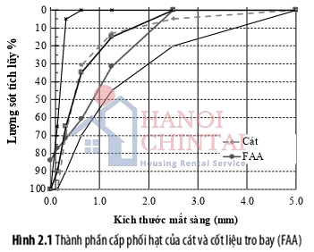 Cốt liệu tro bay được chế tạo từ hỗn hợp xi măng, tro bay và thủy tinh lỏng. Tỉ lệ xi măng:tro bay là 1:4, tỉ lệ thủy tinh lỏng:(xi măng+tro bay) là 1:2. Cốt liệu tro bay được sấy ở 100°C trong 24 giờ. Cốt liệu tro bay được chuẩn bị ở trạng thái bão hòa khô bề mặt trước khi trộn vữa xi măng với tỉ lệ thay thế cát theo thể tích 0%, 10%, 30%, và 50%. Một số đặc trưng vật lý của cốt liệu tro bay được khảo sát như khối lượng riêng là 1,84 g/cm³, độ hút nước bão hòa là 23,27%. Thành phần hạt của cát và cốt liệu tro bay được thể hiện trong Hình 2.1. Module độ lớn của cốt liệu tro bay đạt 3,26. Cốt liệu tro bay có thành phần hạt thô nhiều hơn so với cát. Với sự kết hợp cả cát và cốt liệu tro bay sẽ cải thiện thành phần hạt của cốt liệu nhỏ trong vữa.