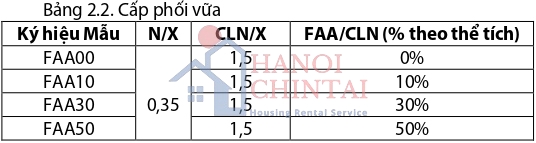 Cốt liệu tro bay (FAA) được chuẩn bị ở trạng thái bão hòa khô bề mặt trước khi sử dụng. Tỉ lệ thay thế cát của cốt liệu tro bay là 0%, 10% 30%, và 50% tương ứng với ký hiệu FAA00, FAA10, FAA30, và FAA50. Bảng cấp phối vữa được thể hiện ở Bảng 2.2. Tỉ lệ nước trên xi măng được cố định là 0,35. Tỉ lệ cốt liệu nhỏ trên xi măng là 1,5.
