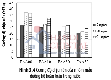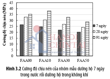 Trong nghiên cứu này, vữa được dưỡng hộ trong nước 7 ngày sau đó tiếp tục được chia ra làm 2 điều kiện. Một là sau 7 ngày dưỡng hộ trong nước sau đó tiếp tục dưỡng hộ trong không khí. Hai là sau 7 ngày dưỡng hộ trong nước, mẫu vẫn được dưỡng hộ trong nước. Kết quả cường độ chịu nén của 4 nhóm mẫu FAA00, FAA10, FAA30, và FAA50 được thể hiện tại lần lượt các Hình 3.6, 3.7, 3.8, và 3.9. Đối với mẫu đối chứng FAA00 sử dụng 100% cát, cường độ chịu nén tại 28 và 91 ngày tuổi khi được dưỡng hộ trong nước đều cao hơn điều kiện dưỡng hộ trong không khí. Tuy nhiên, đối với nhóm mẫu sử dụng cốt liệu tro bay thay thế một phần cát (FAA10, FAA30, và FAA50), cường độ chịu nén của mẫu được dưỡng hộ tại 7 ngày trong nước rồi trong không khí đều cho cường độ cao hơn mẫu được dưỡng hộ hoàn toàn trong nước tại 28 và 91 ngày. Điều này được thể hiện rõ hơn trong Hình 3.10.