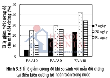 Hình 3.4 thể hiện kết quả cường độ chịu nén của nhóm vữa dưỡng hộ hoàn toàn trong nước. Xu hướng kết quả cũng tương tự như điều kiện dưỡng hộ 7 ngày trong nước rồi tiếp tục dưỡng hộ trong không khí. Khi tỉ lệ thay thế cát bằng cốt liệu tro bay tăng thì cường độ chịu nén của mẫu giảm. Khác với điều kiện dưỡng hộ trước, càng về tuổi muộn tỉ lệ giảm cường độ của mẫu sử dụng cốt liệu tro bay thay thế cát càng cao, xem tại Hình 3.5. Tuy nhiên, mẫu FAA10 với tỉ lệ thay thế 10% cốt liệu nhỏ có tỉ lệ giảm cường độ dưới 10% so với mẫu đối chứng là chấp nhận được.
