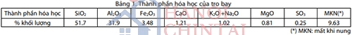 Tro bay sử dụng trong thí nghiệm là tro bay loại F, có hàm lượng CaO thấp hơn 6%, theo tiêu chuẩn ASTM C618 [20]. Hàm lượng các oxit trong tro bay được trình bày trong Bảng 1. Thành phần chủ yếu của tro bay là SiO2 (chiếm 51.7%) và Al2O3 (chiếm 31.9%), lượng mất khu nung khá cao ở mức 9.63%. Thành phần hóa học của tro bay được trình bày trong bảng 1.