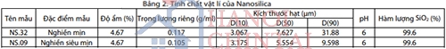 Nanosilica sử dụng 2 cấp độ nghiền mịn và nghiền siêu mịn. Thành phần tính chất vật lí được trình bày trong bảng 2, trong đó D(10), D(50) và D(90) là phân bố kích thước hạt tích lũy của mẫu tỷ lệ đạt tương ứng 10%, 50% và 90%.