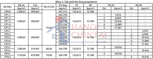 Các cấp phối bê tông geopolymer dùng cho nghiên cứu này được trình bày trong Bảng 3. Để nghiên cứu ảnh hưởng của phụ gia nanosilica, các cấp phối CP0, CP1 và CP2 dùng chung tỷ lệ cốt liệu 75:25 và tỷ lệ SS/SH = 1.75, hàm lượng nanosilica NS.32 hoặc NS.09 thay thế tro bay lần lượt từ 1% đến 5% khối lượng. Ngoài ra các cấp phối CP3 và CP4 với tỷ lệ cốt liệu lần lượt là 80:20 và 70:30 cũng được thiết kế thực nghiệm để khảo sát ảnh hưởng của tỷ lệ cốt liệu đến tính chất cơ học của bê tông geopolymer.