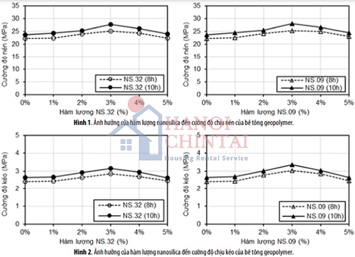 Nghiên cứu cũng đồng thời được thực hiện để khảo sát ảnh hưởng của thời gian dưỡng hộ nhiệt và tỷ lệ cốt liệu đến cường độ của bê tông. Kết quả thực nghiệm chỉ ra hàm lượng phụ gia nanosilica và tỷ lệ cốt liệu hợp lý để làm gia tăng cường độ của bê tông geopolymer cốt liệu nhỏ.