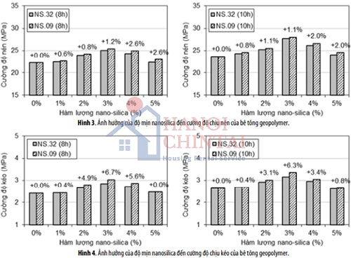 - Khi thay thế tro bay đến 5% khối lượng, nanosilica làm gia tăng cường độ chịu nén của bê tông geopolymer từ 0.8% đến 18.3% và làm gia tăng cường độ chịu kéo đến 26.9%.