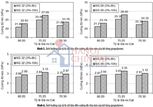 - Bê tông geopolymer dùng tỷ lệ cốt liệu 75:25 cho cường độ chịu nén cao hơn từ 13.4% đến 20.8% và cường độ chịu kéo cao hơn từ 3.3% đến 13.9% so với các cấp phối dùng tỷ lệ cốt liệu 80:20 và 70:30.