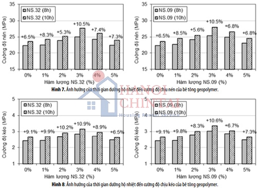 Ảnh hưởng của thời gian dưỡng hộ nhiệt đến cường độ chịu kéo và nén của bê tông geopolymer dùng phụ gia nanosilica cũng được khảo sát trong nghiên cứu này. Kết quả thực nghiệm cho thấy khi tăng thời gian dưỡng hộ nhiệt từ 8 giờ lên 10 giờ, cường độ chịu nén của bê tông geopolymer tăng từ 5.3% đến 10.5% và cường độ chịu kéo cũng tăng từ 6.5% đến 10.9%. Sự gia tăng cường độ chịu nén và kéo lớn nhất vẫn được tìm thấy ở các cấp phối có hàm lượng nanosilica 3%.