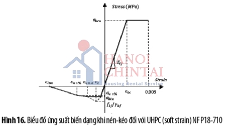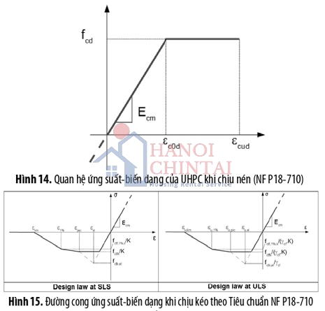 Để thiết kế ở trạng thái giới hạn SLS và ULS, NF P18-710 cho phép sử dụng mối quan hệ ứng suất-biến dạng của UHPC như trong Hình 14 và Hình 15.