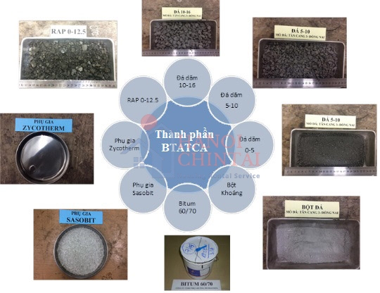 Nhóm nghiên cứu xác định các thành phần cần thiết bao gồm: vật liệu RAP, đá dăm, bột khoáng, chất kết dính bitum, phụ gia Sasobit, phụ gia Zycotherm (hình 1).