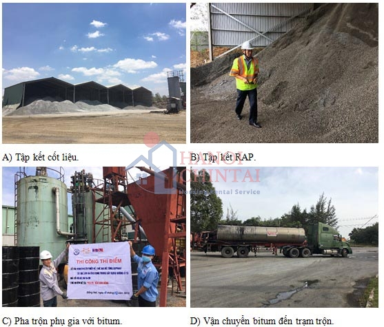 Hình 2 và 3 thể hiện quá trình chế tạo hỗn hợp ở trạm trộn và thi công thí điểm đoạn Km 25+200 đến 25+500 thuộc Quốc lộ 51 (Biên Hòa - Vũng Tàu), diện tích thi công đánh giá thí điểm là 4.056,5 m². Sau khi thi công xong, đoạn đường được thử nghiệm đánh giá định kỳ ở các mốc thời gian 3, 6, 12, 18 và 24 tháng. Các kết quả thí nghiệm đánh giá kết cấu mặt đường hiện tại đáp ứng được yêu cầu đảm bảo khai thác với độ lún mặt đường đạt trung bình 4 - 5 mm, chỉ số gồ ghề IRI < 2,2 mm/m, độ nhám 0,75 - 0,84 mm, trên mặt đường không xuất hiện vết nứt.