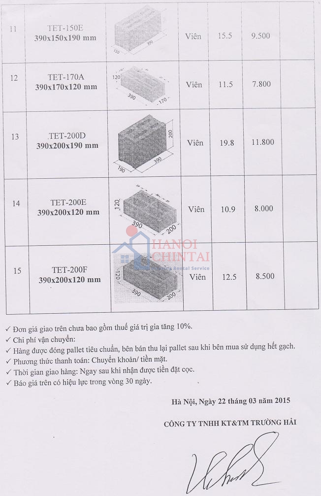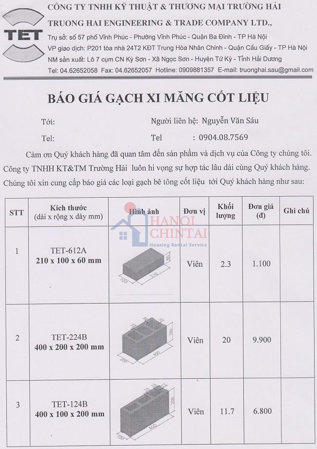 Công ty Trường Hải: Báo giá sản phẩm Gạch Xi măng cốt liệu
