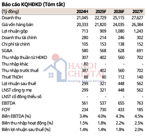 Cho năm 2025, Mirae Asset dự báo doanh thu và lợi nhuận sau thuế của công ty mẹ Coteccons lần lượt là 22.729 tỷ đồng (tăng 8% so cùng kỳ) và 321 tỷ đồng (tăng 7,4% so cùng kỳ), với EPS là 3.217 đồng).
