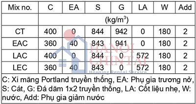 Tỷ lệ trộn các loại bê tông được thể hiện ở Bảng 1. Bốn loại bê tông được chế tạo có ký hiệu như sau: CT: ký hiệu của bê tông truyền thống được thí nghiệm để so sánh đánh giá; EAC ký hiệu của bê tông cốt liệu truyền thống có sử dụng phụ gia trương nở; LAC ký hiệu của bê tông cốt liệu nhẹ; LEC ký hiệu của bê tông cốt liệu nhẹ có sử dụng phụ gia trương nở. Tất cả các loại bê tông có cùng tỷ lệ: nước/xi măng hoặc (xi măng + phụ gia trương nở khi bê tông sử dụng phụ gia trương nở) là 45%; lượng xi măng hoặc (xi măng + phụ gia trương nở khi bê tông sử dụng phụ gia trương nở) là 400kg/m³; lượng phụ gia giảm nước là 2kg/m³ để đảm bảo độ sụt là 10 - 17 cm và hàm lượng khí trong bê tông là 2 - 4%; và tỷ lệ thể tích của cát/cốt liệu là 48%.