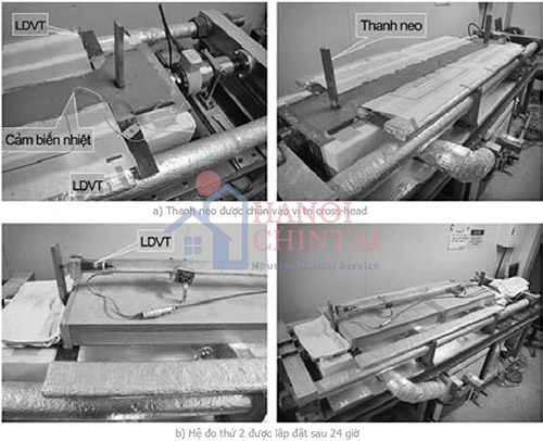 Một TSTM trong phòng thí nghiệm được sử dụng để kiểm tra ứng suất dọc trục của mẫu có kích thước 120x120x1200 mm (Hình 1). Mẫu được đúc ngay trong khuôn của TSTM. Toàn bộ quá trình đo được điều khiển tự động bởi một chương trình máy tính [2]. Hai cảm biến nhiệt đo nhiệt độ bên trong mẫu. Biến dạng dọc trục của mẫu lần lượt được đo bởi hai hệ đo dịch chuyển. Trong 24 giờ đầu sau khi đổ, biến dạng của mẫu được đo thông qua hệ thứ nhất, đo dịch chuyển giữa hai con trượt (cross-head). Sau 24 giờ, biến dạng của mẫu sẽ được đo thông qua sự đo dịch chuyển giữa hai thanh thép được chôn vào hai điểm đầu của mẫu trong khi đổ (Hình 1). Mục đích cho việc sử dụng hệ đo thứ hai là để loại trừ sai số do biến dạng bản thân của hai con trượt xảy ra bởi biến dạng của mẫu.