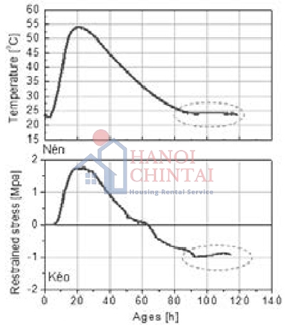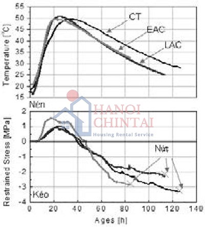 Kết quả thí nghiệm của giai đoạn nhiệt, và ứng suất trong mẫu của bê tông CT, EAC, và LAC được thể hiện trên Hình 2. Trên hình vẽ thấy rằng tất cả bê tông đều bị nứt trước khi nhiệt độ trong mẫu trở về nhiệt độ trong phòng. Thông thường, nếu kết cấu bị ngàm tuyệt đối thì ứng suất nén phát sinh do trương nở do nhiệt tăng và ứng suất kéo phát sinh do co do nhiệt độ giảm. Tuy nhiên, từ kết quả thí nghiệm, ứng suất nén của bê tông CT bắt đầu giảm tại thời điểm giờ thứ 26 và nó xảy ra trước khi nhiệt độ bắt đầu giảm tại giờ thứ 36. Kết quả này là bởi hiện tượng tự co ngót trong bê tông xảy ra trong ngày đầu tiên của bê tông truyền thống. Ứng suất nén tiếp tục giảm do hiện tượng tự co ngót trong khi co ngót do nhiệt lại xảy ra cùng lúc. Sau đó, sự phát triển nhanh của ứng suất kéo vượt quá cường độ chịu kéo của nó và xuất hiện vết nứt tại nhiệt độ 28°C tương ứng ứng suất 3.3 Mpa. Như vậy, dưới điều kiện khắt khe thì bê tông truyền thống (CT) có rủi ro cao về nứt nhiệt.