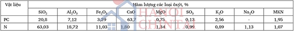 Xi măng PC40 Kim Đỉnh (PC) có khối lượng riêng 3,07 g/cm³ và sót sàng 0,09 mm là 0,98% được sử dụng làm chất kết dính. Lượng nước tiêu chuẩn của xi măng là 31,5%, thời gian bắt đầu đông kết là 105 phút và kết thúc là 165 phút. Các tính chất của PC thoả mãn yêu cầu kỹ thuật theo TCVN 2682:2009. Bột ngói (N) được gia công từ các phế thải ngói vỡ đến cỡ hạt nhỏ hơn 0,09 mm, có khối lượng riêng 2,68 g/cm³, được sử dụng thay thế xi măng nhằm cải thiện các đặc tính của xi măng PC ở nhiệt độ cao. Thành phần hoá của các vật liệu được giới thiệu trong Bảng 1.