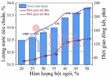 Hình 1. Lượng nước tiêu chuẩn và thời gian đông kết của hỗn hợp chất kết dính.