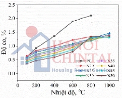 Mẫu PC có cường độ chịu nén cao hơn mẫu chứa bột ngói ở khoảng 25÷200°C. Bột ngói là phụ gia khoáng không có hoạt tính ở nhiệt độ thường nên đã giảm sản phẩm hydrat của mẫu, giảm cường độ nén. Tuy nhiên, ở nhiệt độ cao hơn 200°C mẫu PC có cường độ chịu nén thấp hơn mẫu chứa bột ngói và ở 1.000°C bị phá huỷ hoàn toàn. Sự mất nước của các thành phần như Ca(OH)2, C-S-H trong đá xi măng không gây ảnh hưởng đến cấu trúc đá xi măng chứa bột ngói. Sự dãn nở của nó có thể phù hợp với đá xi măng ở nhiệt độ cao, có thể làm giảm co và hạn chế sự suy giảm cường độ. Như vậy, khả năng làm việc tốt nhất của đá CKD là 800°C. Việc thay thế một phần xi măng PC bằng 30% N sẽ cải thiện được cường độ nén còn lại của xi măng ở 800°C. Một số nghiên cứu chỉ ra, sử dụng 20% sa mốt hoặc 20% bột gạch thay thế xi măng cũng có thể chế tạo được CKD, vữa có khả năng chịu nhiệt ở mức nhiệt độ này [16], [17]. Nghiên cứu khác cho rằng, sự kết hợp giữa phụ gia khoáng 20% tro bay và 10% bột ngói vỡ với cho chất kết dính có cường độ chịu nén 37,7 MPa và độ co 1,26% [19]. Mẫu chứa bột ngói mặc dù có cường độ chịu nén thấp hơn nhưng độ co giảm do thành phần tro bay với độ hoạt tính cao hơn đã thể hiện vai trò pozzolanic, hạn chế thành phần Ca(OH)2 trong đá xi măng nhưng sự mất nước của các thành phần khoáng cũng như nóng chảy làm tăng độ co.