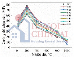 Hình 3. Cường độ chịu nén của đá chất kết dính theo nhiệt độ.