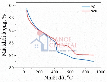Mẫu chứa bột ngói có lượng nước tiêu chuẩn cao hơn mẫu PC nên sự bay hơi nước diễn ra mạnh mẽ hơn khi đốt nóng dẫn đến mất khối lượng nhiều hơn ở khoảng nhiệt nhỏ hơn 200°C. Nhiệt độ tăng, khối lượng của mẫu 30N giảm ít hơn so với mẫu PC và nhiều hơn ở khoảng nhiệt độ 400 ÷ 800°C. Lúc này khối lượng mẫu PC mất khoảng 10 ÷ 16% trong khi mẫu 30N mất khoảng 8 ÷ 13 %. Quá trình mất nước hoá học, sự phân huỷ các khoáng trong đá xi măng diễn ra trong giai đoạn này làm khối lượng đá xi măng giảm mạnh [21], [22]. Sử dụng bột ngói làm phụ gia khoáng thay thế xi măng đã giảm sự mất khối lượng của đá xi măng ở nhiệt độ cao.