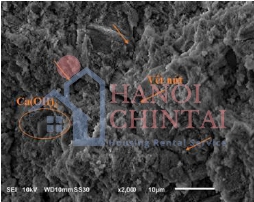 Ảnh SEM của mẫu CKD chứa 30% N và mẫu PC được nung ở 800°C thể hiện Hình 5 và Hình 6. Ảnh SEM mẫu chứa 30% N quan sát chủ yếu thấy pha nóng chảy, các tinh thể và lỗ rỗng nhỏ. Bột ngói dưới dạng hạt mịn lấp đầy các lỗ rỗng trong đá xi măng, tăng độ đặc cho mẫu. Các vết nứt nhỏ quan sát thấy trong ảnh SEM mẫu PC khi nung ở 800°C. Các vết nứt này có xu hướng giảm dần cường độ chịu nén của mẫu. Ngoài ra, khoáng Ca(OH)2 với dạng phiến lục giác vẫn quan sát thấy trong mẫu. Sự khử nước của Ca(OH)2 tạo CaO có thể gây bất lợi cho mẫu khi nó hút ẩm và thuỷ hoá [1].