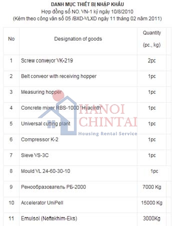 Bộ Xây dựng xác nhận: Toàn bộ máy móc thiết bị, vật tư trong hợp đồng và phụ lục hợp đồng đã ký giữa các bênnêu trên là thiết bị đồng bộ nhập khẩu để sản xuất bê tông nhẹ của Công ty cổ phần vật liệu nhẹ Thăng Long (có danh mục thiết bị đính kèm) trong nước chưa sản xuất được. Trong đó: Máy chính làmáy trộn RBS-1000 “Hyacinth”.