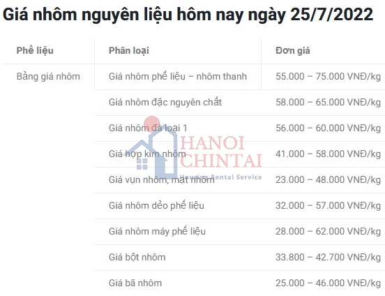 Giá nhôm nguyên liệu hôm nay ngày 25/07/2022 giao động từ từ 23.000 đến 75.000 đồng, tùy từng loại. Trong khi giá nhôm trên thị trường thế giới tăng 1.19% so với mức giá trước đó.
