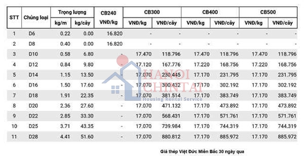 Thương hiệu thép Việt Đức bán CB240 ở mức 16,82 triệu đồng/tấn, còn thép thanh vằn D10 CB300 có giá 17,47 triệu đồng/tấn.