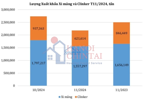 Lượng xi măng và clinker xuất khẩu giảm đáng kể khoảng 20% so với tháng trước ước đạt gần 2,18 triệu tấn (xi măng: 1,56 triệu tấn; clinker: 0,62 triệu tấn). Ngoại trừ các thị trường xuất khẩu như Philippines, Lào và Peru tăng, các thị trường xuất khẩu chủ yếu khác đều có xu hướng giảm. Giá trị xuất khẩu trong tháng 11 ước đạt 82,79 triệu USD giảm 23% so với tháng 10 và giảm 16% so với cùng kỳ năm 2023.