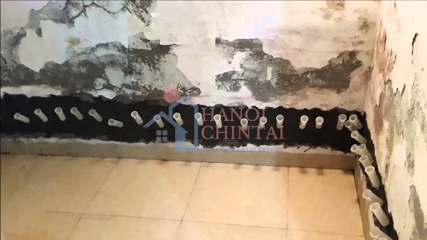 Bước 1: Tiến hành đục phần chân tường khoảng 30cm đến 40 cm. Lưu ý chỉ đục lớp vữa bên ngoài và không được gây tác động vào phần gạch phía trong.