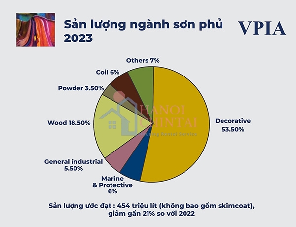 Ngành Sơn trang trí ước tính giảm 23% về sản lượng so với năm 2022, chỉ có duy nhất 1 doanh nghiệp có tăng trưởng dương; phần còn lại đều có mức tăng trưởng âm với các chỉ số khác biệt nhau rõ rệt. Các doanh nghiệp tại phía Bắc ghi nhận mức tăng trưởng âm từ 25 - 30%; trong khi các doanh nghiệp tại phía Nam có mức giảm sâu hơn trên 30%; thậm chí có doanh nghiệp giảm lên đến 50%.