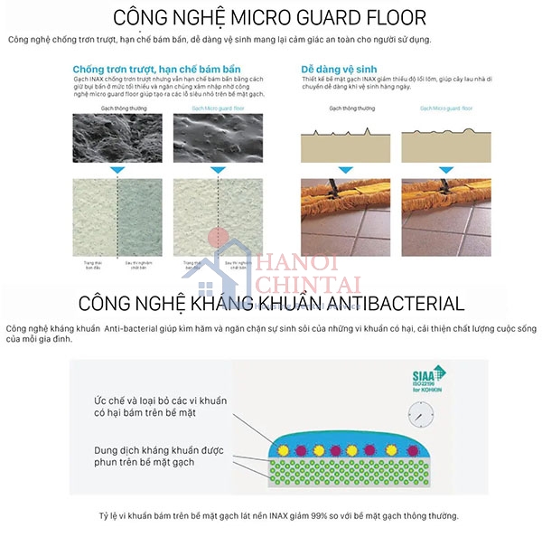 INAX đã giải quyết các vấn đề trên nhờ công nghệ Micro Guard Floor chống trơn trượt độc đáo với lớp men đặc biệt bao phủ lên bề mặt gạch gồ ghề, khiến các vết bẩn khó bám lên gạch, cải thiện hiệu suất làm sạch. Nhờ đó, gạch lát sàn INAX có chỉ số chống trượt ấn tượng và giải quyết được vấn đề vệ sinh mà khách hàng gặp phải. Bên cạnh đó, công nghệ Antibacteria với lớp kháng khuẩn bao phủ lên bề mặt gạch, ngăn chặn sự sinh sôi của những vi khuẩn có hại.