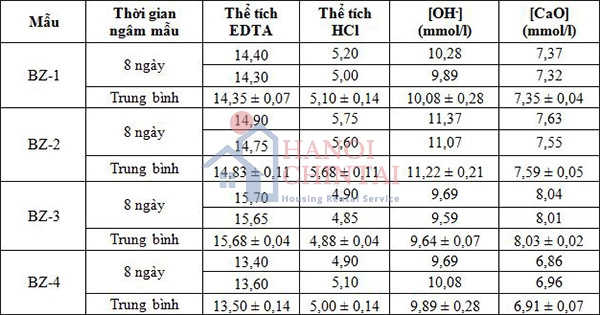 Kết quả thử nghiệm hoạt tính pozzolanic của hỗn hợp 100ml nước và 20g xi măng gồm: 20% phụ gia hoạt tính đá bazan và 80% xi măng Supreme OPC ở 40°C sau khoảng thời gian 8 ngày trong tủ hấp được thể hiện như Bàng 1.