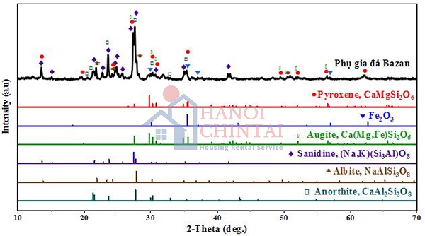 Hình 1. Phổ chồng XRD của các khoáng vật trong phụ gia đá bazan. [9]
