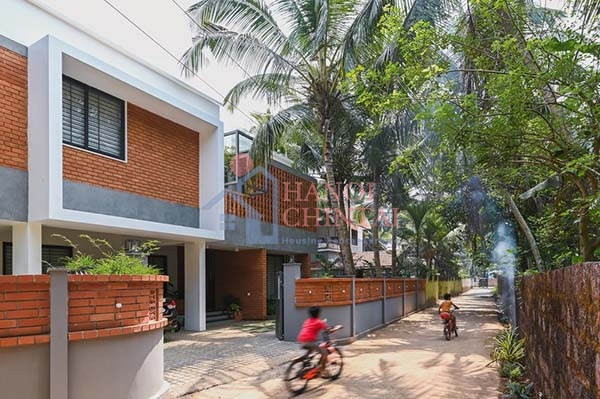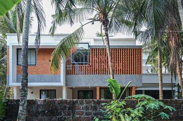 Với diện tích sử dụng lên đến hơn 300 m2, công trình nhà nổi bật một màu cam của vật liệu gạch nung trải dài khắp không gian phía ngoài. Bao quanh căn nhà là những rặng dừa rợp bóng mát khắp phần sân phía trước.