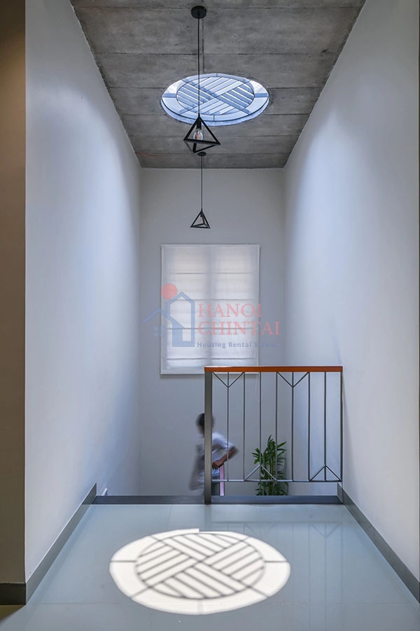 Màu sắc tối giản, phong cách thiết kế hiện đại của phần trần nhà khu vực hành lang tạo nên một không gian độc đáo và thoáng sáng cho cả tầng trên.