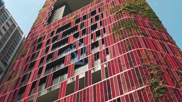 Khách sạn Oasis ở Singapore được bao phủ gần như toàn bộ bằng những tấm lưới với nhiều sắc thái đỏ khác nhau. Những cây dây leo mọc len lỏi trên những tấm kim loại tạo nên vẻ đẹp kỳ lạ, ấn tượng, làm liên tưởng đến đặc trưng khí hậu nhiệt đới của Singapore.