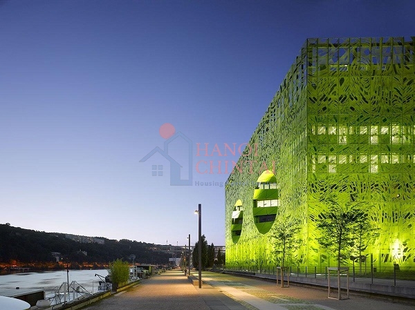 Toàn bộ tòa nhà được bao phủ bởi lớp vỏ nhôm đục lỗ xanh lá cây với hoa văn hình sin nhằm lọc không khí và ánh sáng xuyên vào. Ngoài ra còn có hai hình tròn to khoét rỗng ở mặt tiền, để lộ ra những dải nhôm và kính màu xanh lá cây chắc chắn.