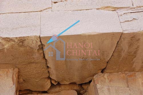 Mũi tên chỉ lỗ hình trứng giữa 2 mảng khối chắc nặng ở phía bắc kim tự tháp Senefru Bent (Ảnh: LiveScience)
