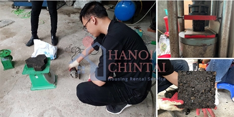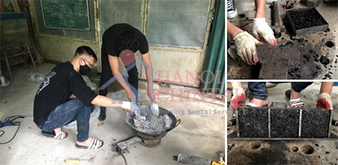 Sau khi hỗn hợp quánh lại lập tức cho vào khuôn đúc sẵn, dùng búa và đầm nén chặt để được thành phẩm.