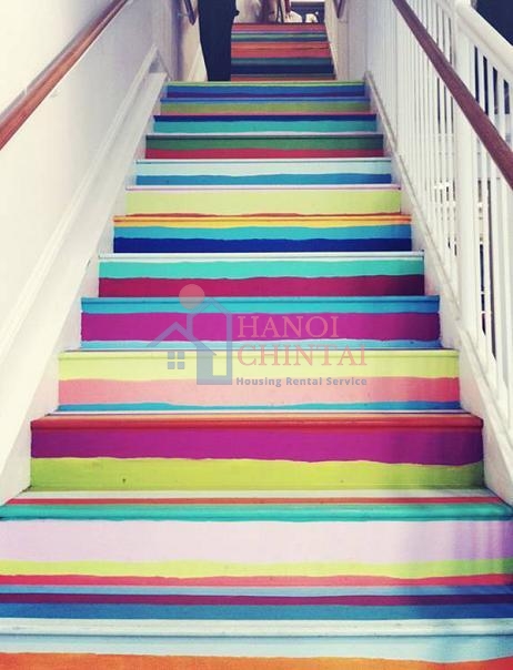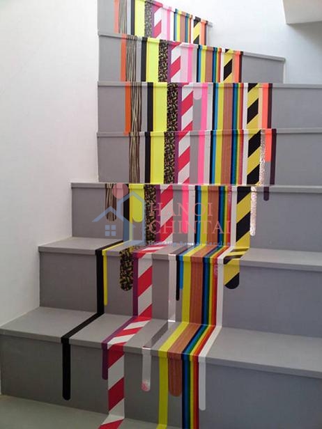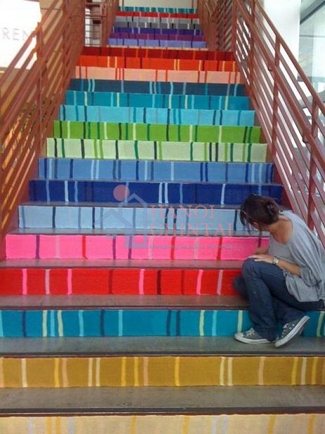 Bạn sẽ có cảm giác cầu vồng trên trời rơi vào nhà mình sau một cơn mưa khi tô màu cầu thang theo cách này. Để tránh lãng phí, bạn nên mua từng hộp sơn nhỏ.