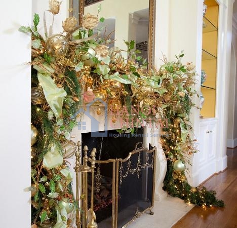 Góc trang trí lò sưởi kết hợp màu xanh lá và vật dụng trang trí màu vàng lấp lánh cùng ánh đèn vàng, đem lại một không gian lung linh và sang trọng. Trang trí này thích hợp với những nhà có màu sơn trắng.