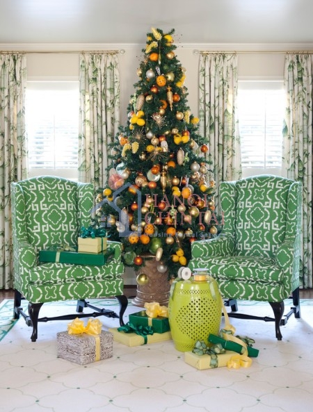 Thiết kế này dành cho nhà có nội thất tông màu xanh lá. Ngoài việc sử dụng tông màu xanh truyền thống, bạn có thể kết hợp với vật dụng màu cam và vàng để trang trí cây thông, điều này mang lại cảm giác vui tươi, ấm áp, hòa hợp với không gian nền xanh.