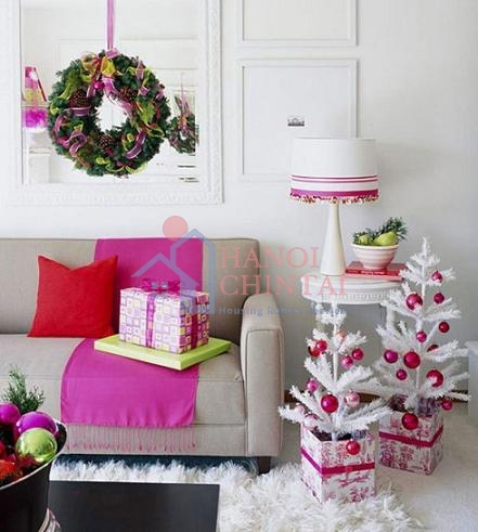 Đối với những không gian nhỏ, bạn có thể trang trí bằng cây thông nhỏ màu trắng với nhiều kích thước. Thiết kế này tạo sự sinh động, kết hợp với màu sắc của vật dụng trang trí có sẵn, vài gói quà xinh xắn cũng đủ tạo nên không khí rộn ràng cho mùa lễ hội.