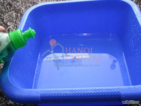 Cho 0,9 lít nước ấm vào trong hộp nhựa; hòa tan xà phòng rửa bát vào trong nước ấm