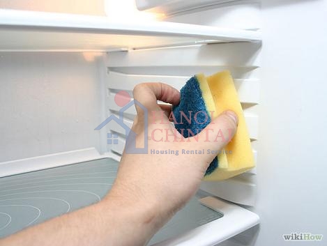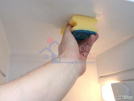 Bạn nên đeo găng tay để bảo vệ bàn tay của mình. Lấy một miếng bọt biển và nhúng vào dung dịch để lau sạch tủ lạnh - lau kĩ trần và hai bên tủ lạnh. Với những khu vực quá bẩn có thể rắc thêm baking soda.