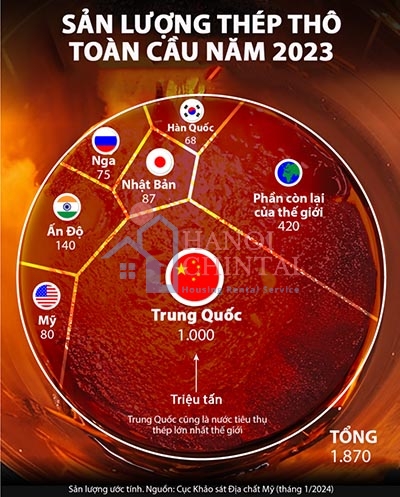 Thép là vật liệu quan trọng với nền kinh tế khi được sử dụng trong nhiều lĩnh vực từ xây dựng, cơ sở hạ tầng, cho tới sản xuất, vận tải. Đồ thị thông tin dưới đây thể hiện các quốc gia sản xuất thép thô lớn nhất thế giới năm 2023, dựa trên dữ liệu công bố vào tháng 1/2024 của Cục Khảo sát Địa chất Mỹ (USGS).